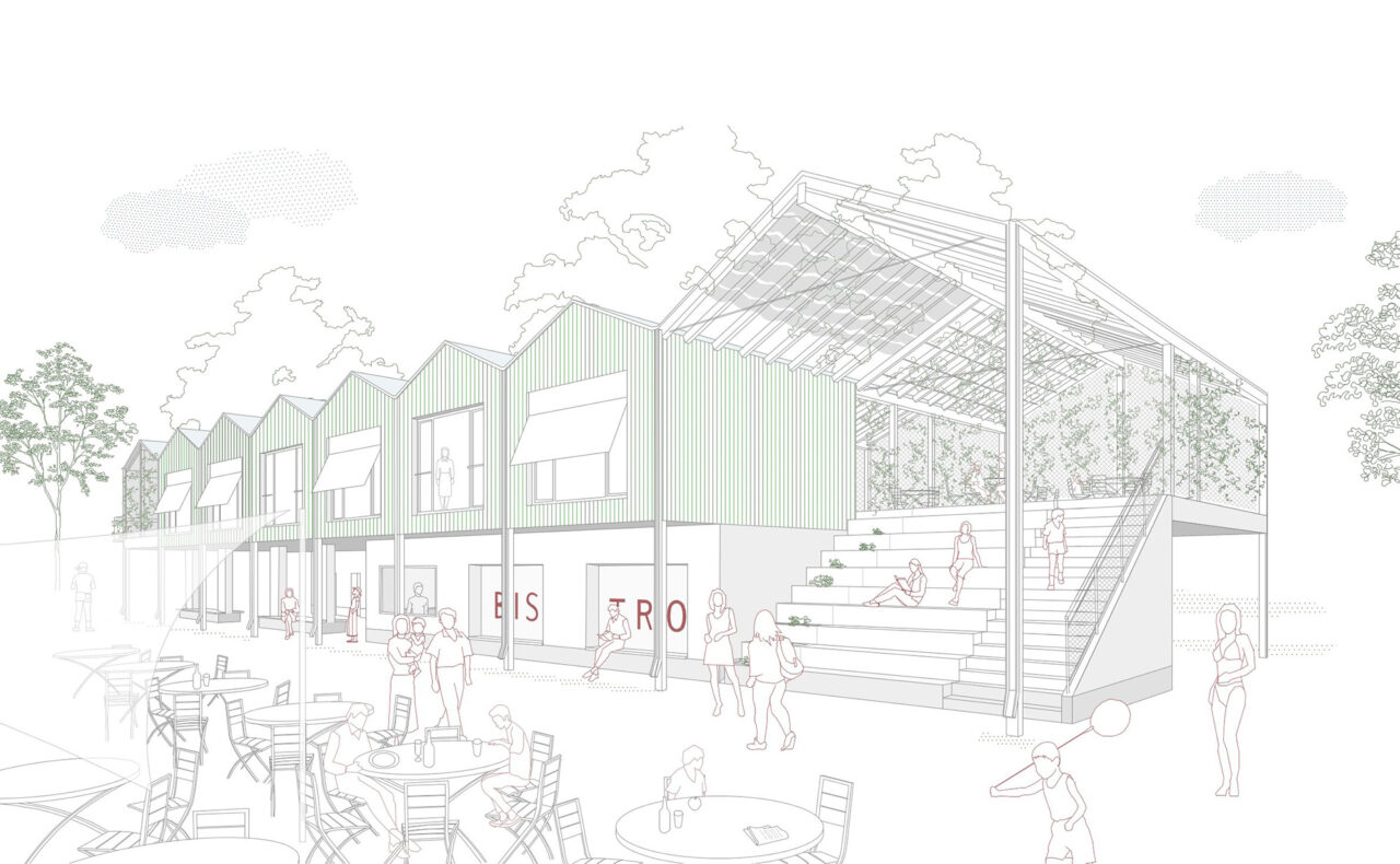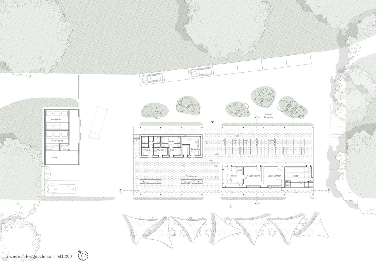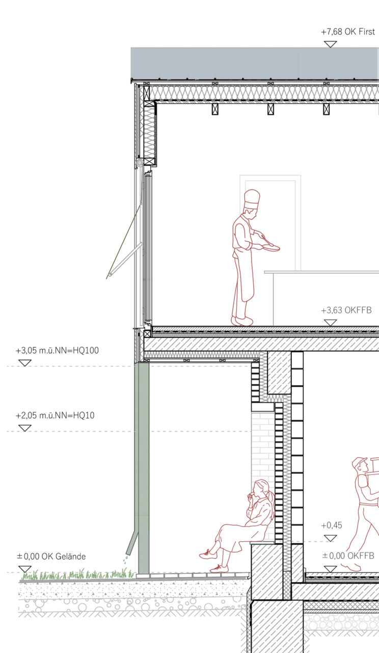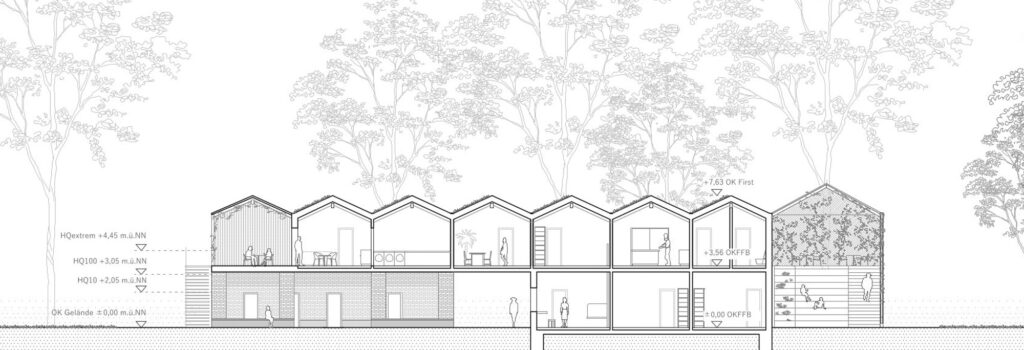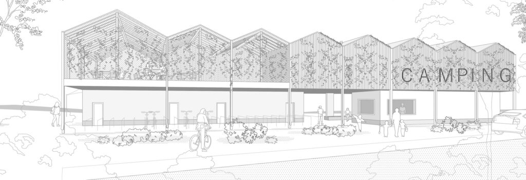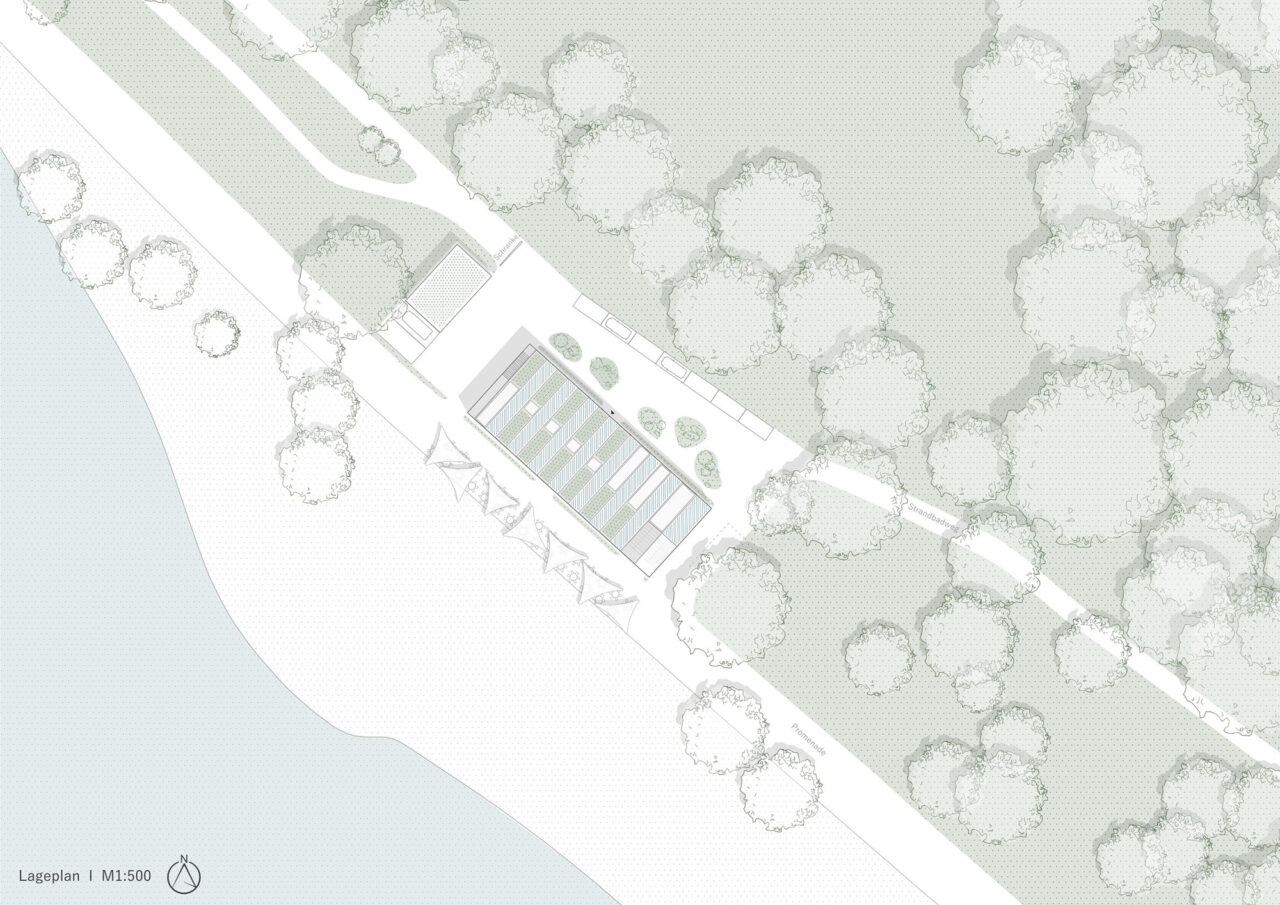 Der Wettbewerbsentwurf für den Neubau des Strandbades am Mannheimer Rheinufer schlägt einen linearen Baukörper vor. Das Dach wird durch eine Reihung von kleinen Satteldächern geformt, wie man sie von klassischen Strandbädern kennt. Im Erdgeschoss bilden zwei zueinander versetzte massive Kerne den hochwassersicheren Sockel für den Holzständerbau des Obergeschosses. Das Gebäude beherbergt zwei voneinander unabhängige Nutzungen: Die zum öffentlichen Strandbad gehörigen Umkleide- und Sanitärräume und ein Bistro, sowie die Duschen und WCs für den ebenfalls hier ansässigen Campingplatz. Durch die geschickte Platzierung der Treppen werden die Benutzerströme diskret zu ihrem jeweiligen Bereich geleitet; die großzügige Sitztreppe am Südostende des Gebäudes führt hinauf zum Bistro mit seinem Freisitz, während die schmalere Treppe am Nordwestende zu den Campingnutzungen führt. Die Gestaltung der Dächer erinnert an die Kleinteiligkeit der umliegenden Kleingärten, was eine charmante Verbindung zur Natur schafft. Insgesamt entsteht so eine idyllische Atmosphäre, die Besucherinnen und Besucher gleichermaßen begeistert und zum Verweilen einlädt.