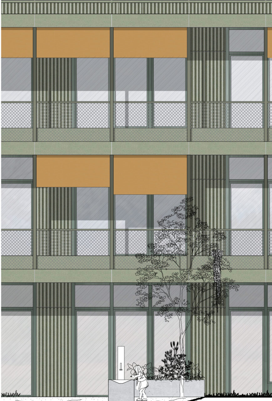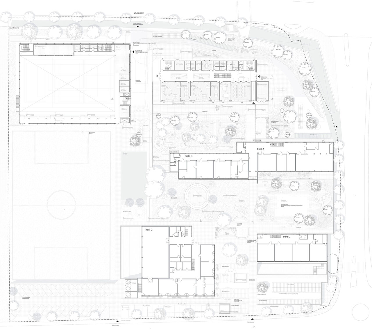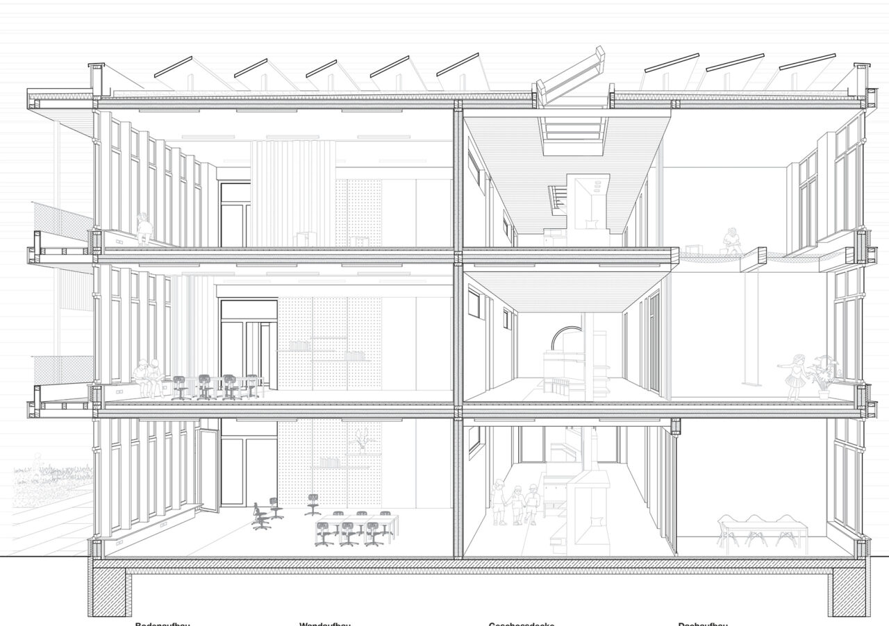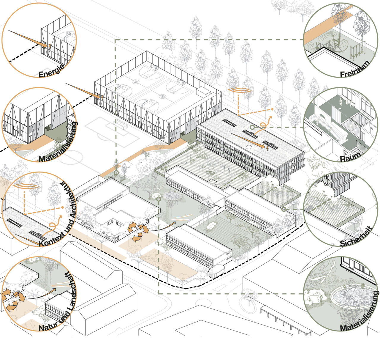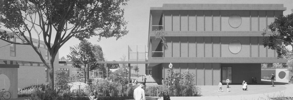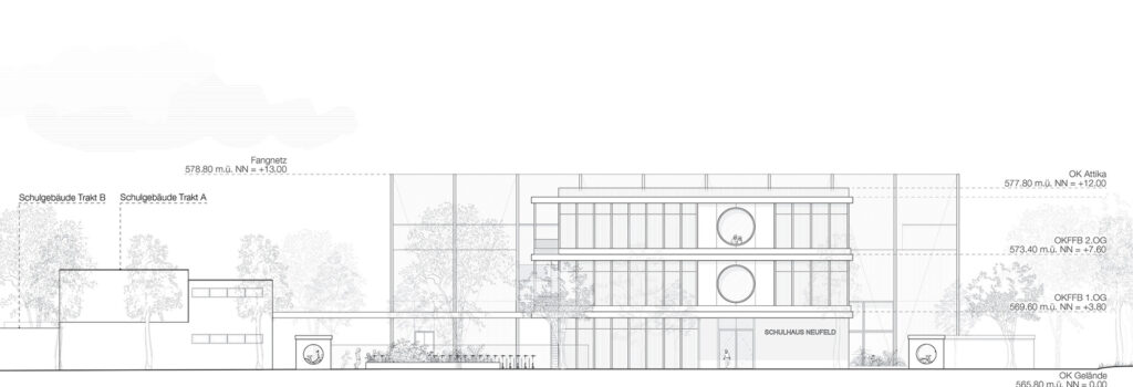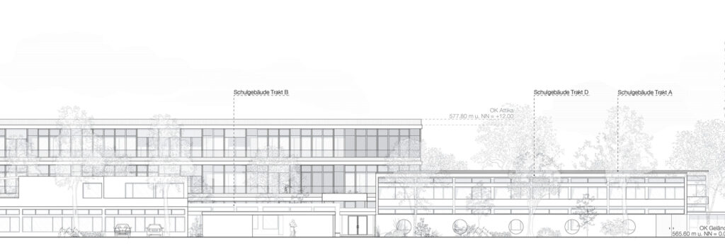 Der Schulbau in der Schweiz genießt ein hohes architektonisches Niveau. Der Wettbewerbsentwurf beinhaltet eine neue Doppelsporthalle, sowie ein dreigeschossiges Gebäude, das die Räume für die Schulerweiterung aufnimmt. Die beiden Neubauten bilden zur vielbefahrenen Straße im Norden hin eine deutliche Kante. Richtung Süden schafft der dreigeschossige Riegel zum Bestandsgebäude hin einen geschützten Außenbereich. Die Schulerweiterung ist bis auf die Treppenkerne und drei Wandscheiben als Holzbau konzipiert.