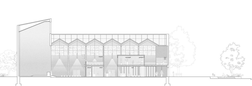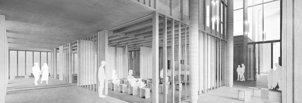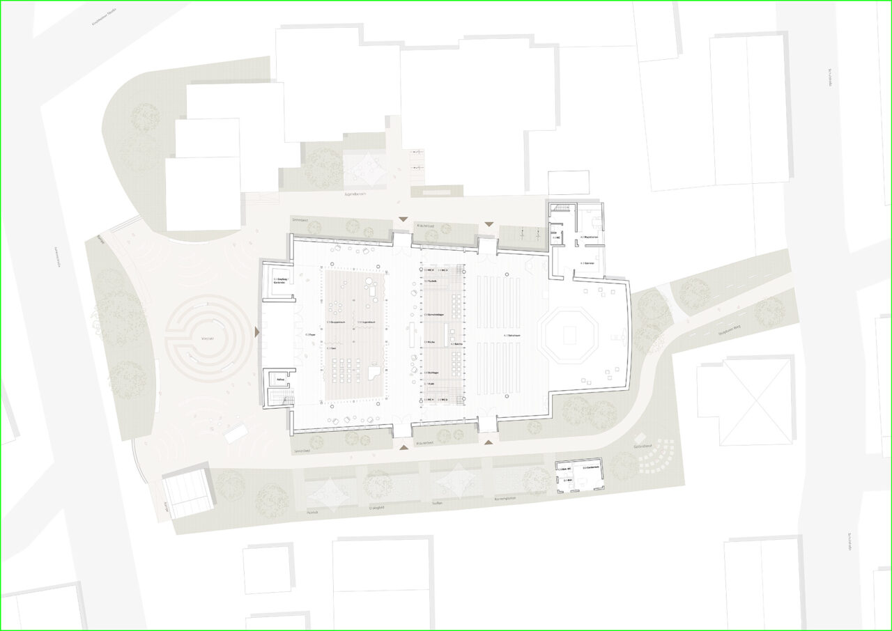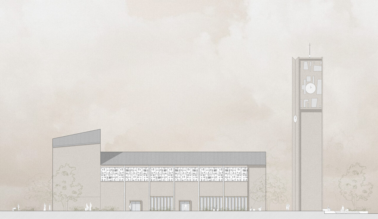 Unser Entwurf für den nicht-offenen Wettbewerb „Transformation der Pfarrkirche St. Magnus in Wernau zum Gemeindezentrum mit Kirche“ sieht einen sensiblen Umgang mit dem Bestand vor. 1960 wurde die von Gerald Reutter entworfene Kirche eingeweiht und prägt seither den Ortskern von Wernau am Neckar. Die Umplanung zur Kirche plus Gemeindezentrum wird erreicht, indem der bestehende Kirchenraum räumlich verkleinert wird. Der als Holzkonstruktion eingestellte „Raum im Raum“ trennt die zwei entstehenden Nutzungseinheiten „Sakralraum“ und „Neues Gemeindezentrum“. Im Haupteinfangsfoyer des Neuen Gemeindezentrum entsteht ein weiterer Einbau als Raum-im-Raum. Dieser schließt an die vorhandene Empore an. Das Raumvolumen öffnet sich im Erdgeschoss seiner Umgebung und kann durch verschiebbare Lamellen, transluzente Vorhänge, sowie Akustik vorhänge flexibel und spontan auf Raumanforderungen reagieren.